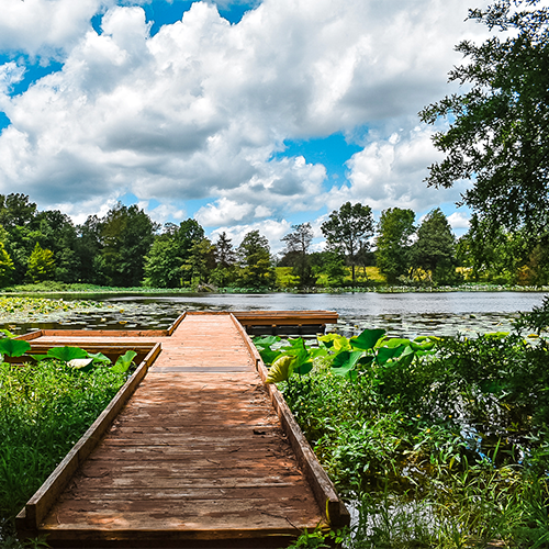 This 24′ x 40′ pavilion has benches for seating, lights & fans, and electrical outlets. The trees harvested as lumber for the pavilion were planted by Ted and Pat Jones in the 1950’s. The floor is imprinted with native plant and animal tracks for educational use.
