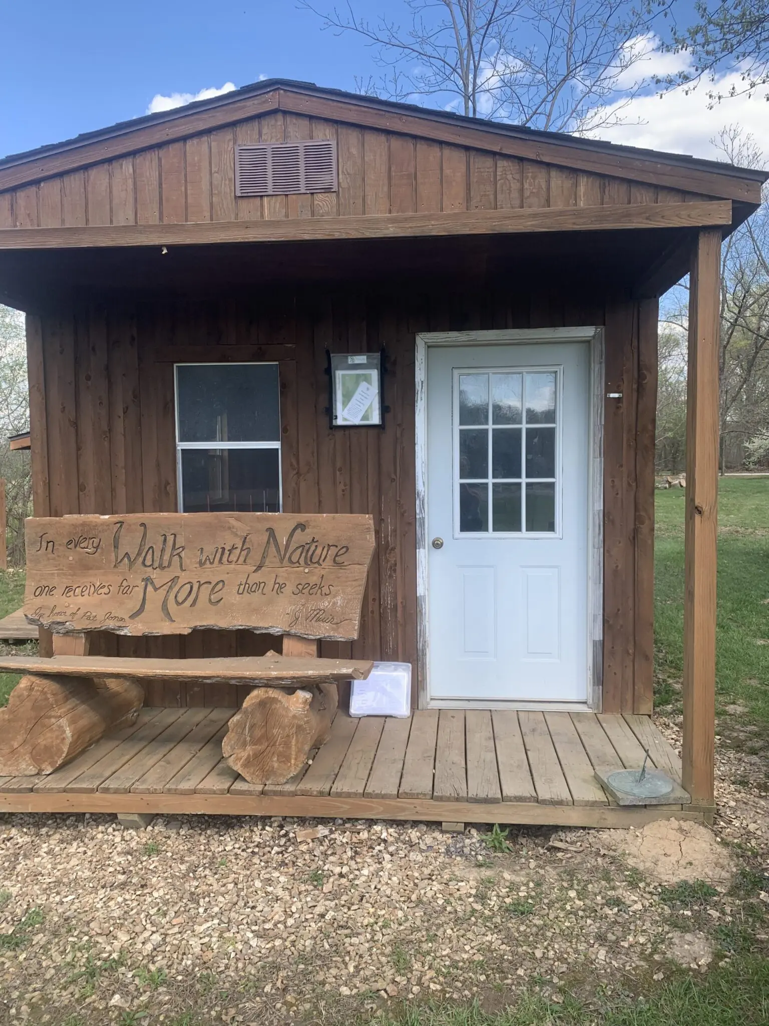 Small shed that holds requested teaching items. The shed can seat 10 students comfortably in inclement weather.
